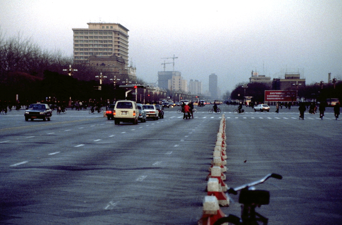 After checking into our hotel, the Hua Du Fandian on the north-east corner of the city, we set out at a little after 4:00pm for a half hour look around Tian An Men Square. Sunset was at about 4:20pm, so with the sightseeing lasting from 4:30pm to 5:00pm, it was largely done in twilight. Nonetheless, we were able to get some feeling for the grandeur of Beijing from the visit. The square can hold over a million people (it did so for Mao’s funeral in 1976), and it contains many of Beijing’s famous landmarks such as the Great Hall of the People, the Museum of Revolutionary History, the Chairman Mao Memorial Hall, the Monument to the People’s Revolutionary Martyrs, the several hundred metres wide Chang’an Avenue (Avenue of Everlasting Peace), Qianmen (the large stone gate which marked the southern entrance into the old imperial city) and the Gate of Heavenly Peace from which Mao proclaimed the People’s Republic in 1949.