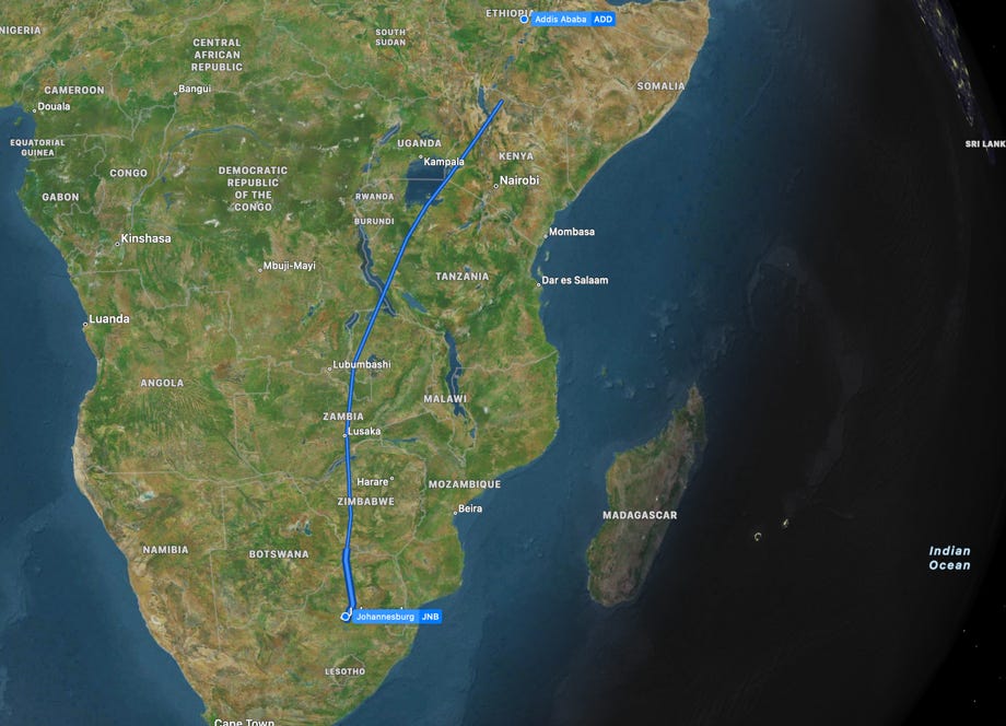 Like all my flights on this trip with Ethiopian Airlines it was a wonderful experience in every way – it is a very impressive airline. Although conditions were overcast with low clouds when we took off in Addis Ababa, the clouds cleared after we had flown southwards for about an hour and I had lovely, clear views of the landscape below for most of the trip on a route that passed over such spectacular areas as Lake Victoria, Lake Tanganyika, Lake Mweru, Lusaka, Lake Kariba, and of course, Johannesburg on final approach to the airport.