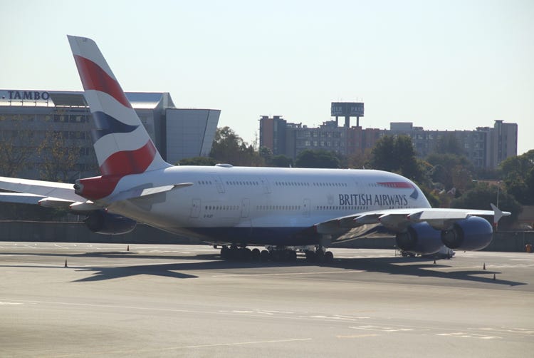 My transit in Johannesburg was a long one – just over eight hours. I wasn’t worried as the beautiful afternoon sunlight gave me a wonderful opportunity to do lots of plane spotting and photography of some rare and usual airlines. It even gave me a chance to get a (poorly lit and badly angled) photo of the plane I will take tonight for the next sector of my flight, which is to London on a British Airways Airbus A380 (G-XLEF).