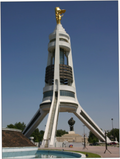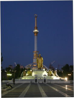 We made a few stops to inspect the grand new monuments devoted to the President. First was the Arch of Neutrality, a huge three-legged high arch erected in 1998 to celebrate Turkmenistan's adoption of an official foreign policy of neutrality. The Arch was topped by a gleaming 12 metre high statue of Niyazov (the President) which revolves through the day so that it always faces the sun. Until last month it was possible to go up to a viewing platform near the top of the spire of the arch, but this was stopped, presumably to stop people photographing the nearby Palace of Turkmenbashi or the associated government buildings of the Ministry of Fairness and Ministry of Defence, both of which were also off-limits to our cameras.