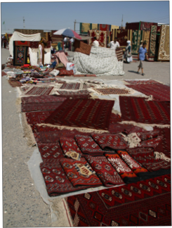 We had arranged to leave at 9 am, but Oleg was 10 minutes late, and then we had to wait for David. Thus, it was 9:40 am before we finally got underway. Our first stop was the Tolkuchka Bazaar on the edge of the city. This was a large and very colourful market held every Thursday, Saturday and Sunday where local people sell everything from melons to carpets to gold to hair shampoo. It is said to be the largest such market in central Asia after Kashgar (China), and it provided a wonderful experience of traditional Turkmen life.