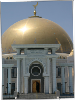 Following this visit, we drove further west to Geok-Depe, the place where the Turkmens made their unsuccessful last stand against the invading Russians during tsarist times. The surrounding fortress wall still stands, but in the middle of the compound now stands the Saparmyrat Mosque, built in the mid-1990s in honour of the President's haj to Mecca. Niyazov had been an ardent atheist during Communist times, but is said to have now adopted pragmatism, which is expressed outwardly as Islam. As many Turkmens cannot afford to undertake a haj to Mecca, this mosque has been designated as an alternative point of pilgrimage, and Turkmens are encouraged to worship here once a year. We were fortunate to be present on a Friday, which is Muslim holy day, and we saw a couple of hundred men leaving and exchanging greetings with each other in a rotating line before venturing inside.