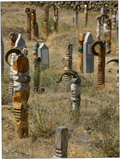 From the home we drove up the steep eastern side of the town to the cemetery. This was a remarkable sight, with each grave marked by a wooden square pole, carved with steps plus "X" marks that are said to derive from the Star of David, topped with goat's horns. The Nokhuri people traditionally consider that the goats' horns offer protection, even though they are also quite devout Moslems, and Nokhuri cemeteries are unique in having graves topped with goats' horns.