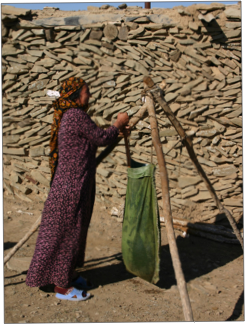 Upon returning to the farmhouse, we were warmly welcomed by the owner who poured cool water over our hands from a metal jug; then we were invited inside for some traditional Nokhuri hospitality. We removed our shoes and sat on mats on the floor around a central plastic mat which served as an area to set out the food. The meal was huge, and included tea, bread, potatoes with egg, milk with salt, lamb cheese, tomatoes, biscuits, preserved grapes and sweets. The hospitality was remarkable from this simple family in a house with no electricity, where the people rise and go to bed with the sun, and who are totally dependent on the annual rains for their livelihood – a problem, as the rains failed to come this year.