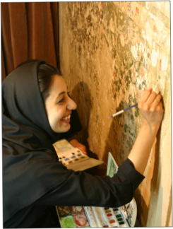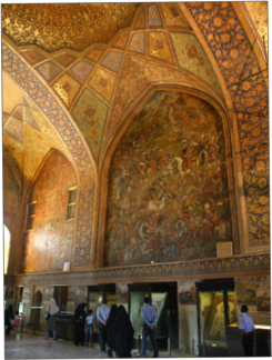 We arrived in esfahan at about 9:15 am, driving through the suburbs to the old city centre. Our first visit was to the Chehel Sotun Palace, built in the late 1600s. The name of the palace means "40 pillars", although the building has just 20 wooden pillars of Lebanese cedar; the balance comes from the beautiful reflection in the long pool (reminiscent of the Taj Mahal) that divides the two long approach paths. Perhaps the highlight of the visit to the palace was entering the grand hall which was decorated with six amazing historical frescoes showing significant events in Iran's (then Persia's) history during the 1400s and 1500s. It was also interesting to see the intricate restoration work being done on some frescoes in adjoining rooms, painstaking work being done by three women.