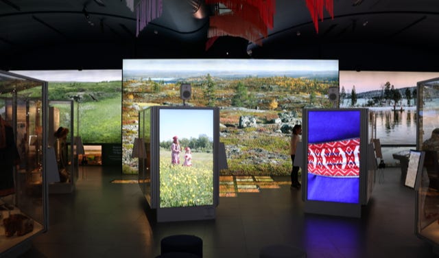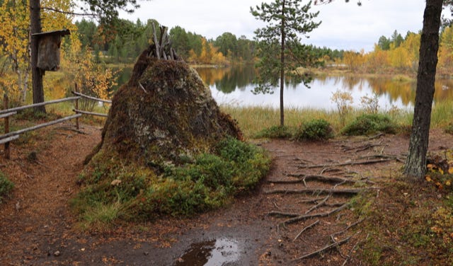 On our last full day in northern Finland (17th September), Di and I undertook a trip to Inari, which is a centre of Sámi culture. Despite overcast weather, we had a wonderful day visiting the superb Museum of Sámi Culture (both the brilliant indoor displays and the reconstructed outdoor buildings and animal traps), seeing the Sámi Parliament Building (briefly), taking a short bush trek to the raids on Juutuanjoki at Jäniskoski, and finally seeing several herds of reindeer on our drive back to Utsjoki.