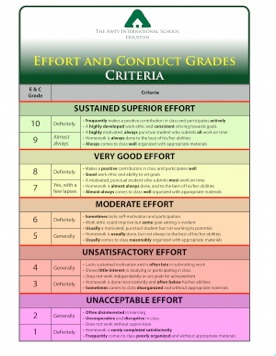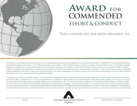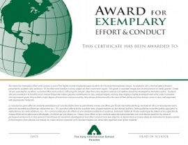 “The Award for Exemplary Effort and Conduct is one of the highest honors bestowed upon students by The Awty International School. Instituted in 2012, the Exemplary Award is presented to students who achieve a '10' for effort and conduct in every subject on their recent term report. This grade is awarded irrespective of achievement or marks gained. Grade 10s are awarded for excellent, sustained effort and conduct, reflecting the School's ideal that every student's talents and abilities should be developed to the fullest extent. Students who are awarded a 10 for effort and conduct frequently make a positive contribution to class and participate actively, they display a highly developed work ethic and a consistent striving towards goals, they exhibit a high degree of motivation and punctuality, they always do homework to the best of their ability and they always come to class well organized with appropriate materials.”