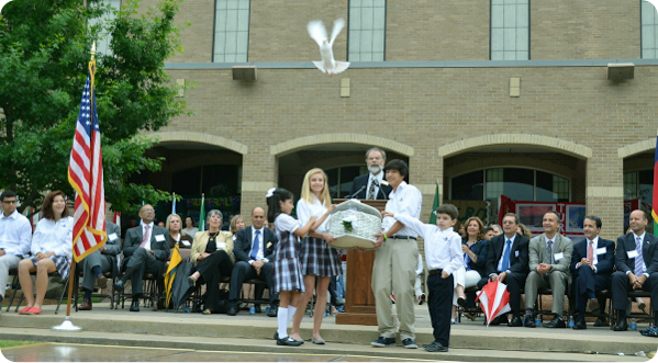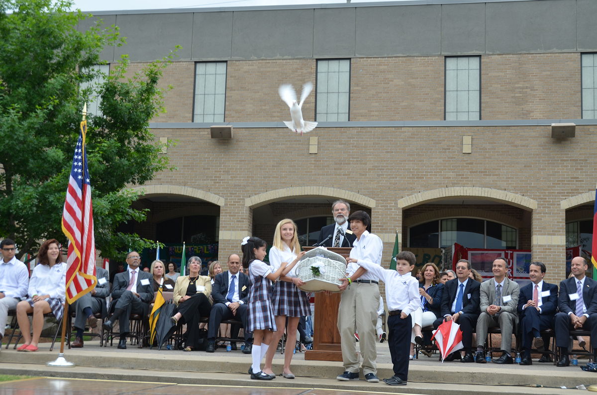 about the Nobel Peace prize and Nobel Peace prize winners.  As a symbol of peace between nations and here at Awty, we concluded the opening ceremony by releasing a peace dove.  This was done by four students, one from each school, two from the International Section and two from the French Section.  The peace dove was a beautiful white dove, also known as a Rock Dove and it had been raised and trained at the Bencal Loft farm, not far from Awty.  As I explained to the students during the ceremony, after the Dove was released it was supposed to circle the sky, after which it would return to the farm where it had been raised and where it would be cared for very well.  As it turned out, someone forgot to share these clear instructions with the dove, who seemed so keen to return home that it forgot to fly a circuit of our courtyard, and flew instead in a purposeful, fast and very straight direction back to its home.