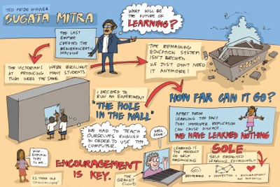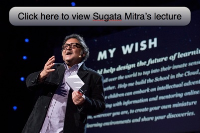 Please do yourself a favour and set aside 20 minutes to watch Sugata Mitra’s very stimulating lecture.  You can see it at http://www.ted.com/talks/sugata_mitra_build_a_school_in_the_cloud.html or by clicking the right image below (the left image can be enlarged as a cartoon summary of the talk).