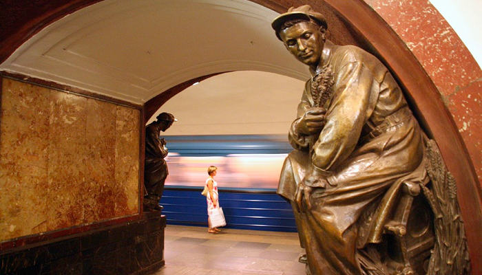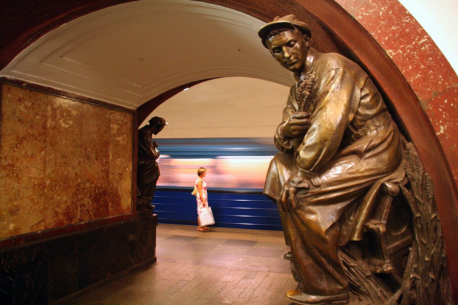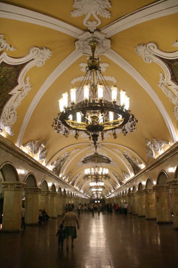 On one of the days when both Di and Andrew were feeling especially unwell, I spent half a day riding the Circle Line of the Moscow Metro, photographing the underground People’s Palaces that characterise the Metro.  Moscow’s Metro is no ordinary subway.  It carries more people each day than the London Underground and New York subway combined, the trains come at intervals of just one or two minutes, and the underground stations are glorious monuments to the triumphs of socialism and the promises of a bright future under Communism that reflect the artistic glories of socialist realism under Stalin.  The red stars, the gold hammers and sickles, the rich mosaics of Lenin inspiring the masses – all these and more are still there in the Moscow Metro for all to see and admire.