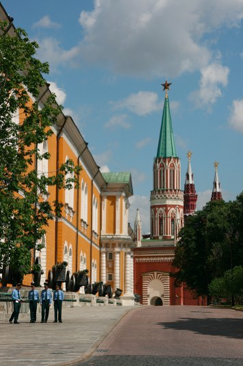 The views of the Kremlin from the river were especially appreciated because two days earlier we had spent a morning walking through the Kremlin.  The word ‘kremlin’ means ‘fortress’, and many Russian towns have a kremlin, the famous one in Moscow being the largest.  Moscow’s Kremlin still serves as the centre of government just as it did during Soviet times, and on the day we visited there were tens of black limousines parked for what was obviously a significant meeting.  Visitors are, of course, not permitted to enter the buildings used by the national government, but there is much to see anyway.  The Kremlin is perhaps Russia’s finest collection of traditional architecture, dating from the 1400s up the present time.  It contains the world’s largest cannon (which never fired), the world’s largest bell (which never rang as it cracked while the metal casting was cooling), some glorious garden parkland (the Alexandrovsky Gardens)  – and those wonderful  buildings.