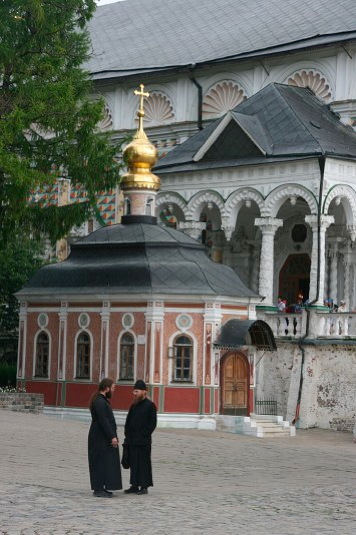 As a substitute to going to Suzdal, we took the shorter journey to Sergiev Posad (still also commonly known by its former Communist name of Zagorsk).  This involved a short Metro trip to Komsomolskaya Metro Station (one of Moscow’s most spectacular, and still named after the Communist Youth League whose members helped to build it during the 1930s) and then an hour and a half train ride.  The highlight of Sergiev Posad is the Trinity Monastery of St Sergius, an eclectic ensemble of buildings dating from 1420.  The monastery is a perfect vision of traditional Russian architecture, with golden and starred domes dominating the exteriors of the buildings, several onion-domed churches with interiors covered in religious icons, their dim interiors illuminated by opaque smoky beams of light and resonant with the sounds of small choirs of priests and nuns, and women with heads covered in scarves expressing their devotion by crossing themselves, kissing icons and praying.  Russian buildings often have strange closing arrangements, and many of the monastery’s buildings are closed on Tuesdays and Wednesdays, as well as the last Friday of each month.  Today was the last Friday of the month.
