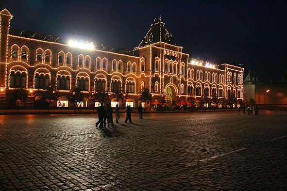 Perhaps the most magical experience we (that is Andrew and I) enjoyed in Moscow was visiting Red Square late last night to see the buildings under lights.  It does not get completely dark in Moscow at this time of year, but it was dark enough by 11 pm to get the effects of the floodlighting on the Kremlin Walls, the State History Museum, St Basil’s Cathedral, the Assumption Cathedral and the various gates and monuments.  On one side of Red Square, the huge GUM department store was lit up with thousands of individual bulbs in a way that made it resemble a castle in Disneyland.  And while we were there, a huge full moon rose over the Spassky Gate – simply unforgettable.