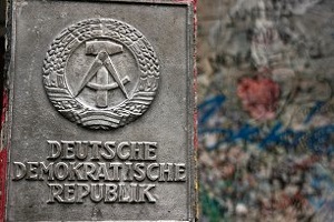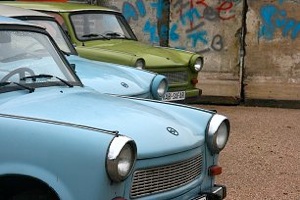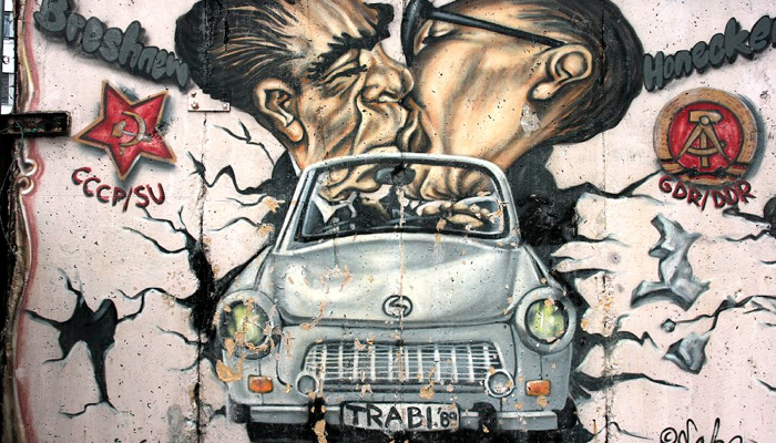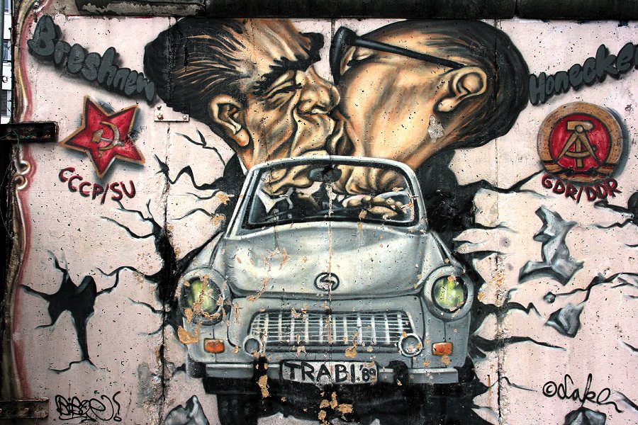 Graffiti on the Berlin Wall shows an East German icon, a Trabant car, driven by DDR leader Erik Honecker and former Soviet leader Leonid Brezhnev in their famous embrace, smashing though the Wall