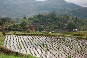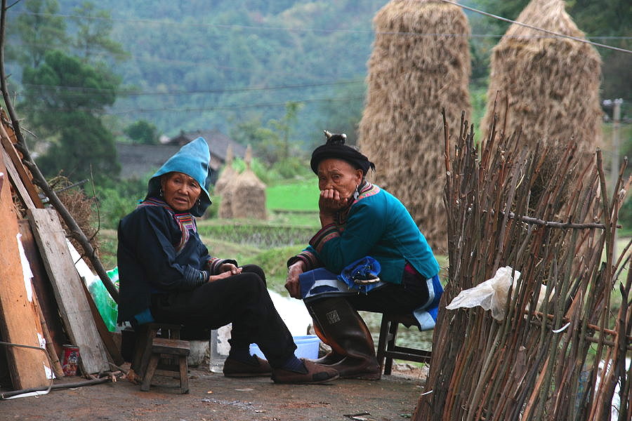 Our final stop for the day was Xian E, a village populated by people of the She tribe.  The village was situated in a spectacular location on the edge of a mountainside, overlooking an expansive valley of terraced rice fields at various stages of cultivation under the intensive care of several farmers with their water buffaloes, interspersed by the steep peaks of limestone hills.