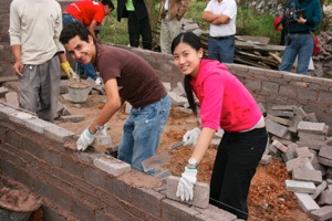 After a Miao-style lunch with many of the local villagers in a building beside the Qingshui River, it was time for our students to perform some serious service work.  Construction of the much-needed new clinic recently commenced in Chengzhong, and the afternoon was spent assisting the local builders with the work.  All our students took turns at three tasks: mixing cement, carrying bricks and laying bricks to build the walls.  Some of our students took immediately to the tasks