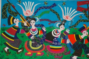 We then spent the entire afternoon at Tonggu, a small village about half an hour’s drive south-east from Xiasi.  Tonggu is known for its naïve-style peasants’ paintings, and we spent the afternoon in a workshop learning the techniques of this form of art.  This was a sensational experience of ‘learning from the peasants’, in spite of the language barriers (the local women who taught us spoke no Putonghua, only Miao language).  The encounter helped all of our students appreciate the intricacy and vibrancy of the Miao paintings, and we were able to come away with beautiful (though usually half finished) paintings before the paint finally ran out in the late afternoon.