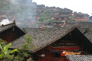 Our final day in Guizhou came all too quickly.  After an early 7:15 am check-out from our hotel and an early breakfast, we drove 75 kilometres east of Majiang to Xijiang, a beautiful mountainous area inhabited mainly by Miao people at the head of a steeply sided gorge with a fast flowing river – the Xi Jiang (or West River).  Xijiang is China’s largest Miao village, with over 1000 households and a population of 5120 people.  Like most Miao villages, the buildings were impressive two or three-storeyed wooden dwellings rising from the river in the bottom of the valley up the steep slopes of the surrounding hills.  As our aim was to gain a deeper understanding of the Miao culture that dominates Majiang county, we spent some time in the excellent museum that has been built in Xijiang before exploring the town more fully.  Large numbers of the villagers were practising for the upcoming dances and pageant to celebrate the Miao New Year, which was scheduled just a few days after our visit.