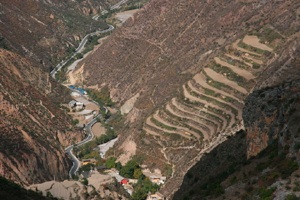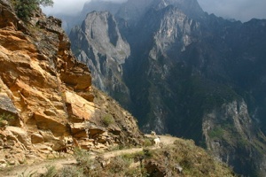 The fourth focus area was Tiger Leaping Gorge.  This beautiful deep gorge, bounded on each side by snow-capped mountains and cut by the rushing rapids of the Yangtze River, is perhaps the best place to see what the Tea-Horse Route looked like in its heyday.  The unfenced narrow tracks still twist around the steep mountainsides, with small teams of horses making their way along the tracks amidst herds of mountain goats through tiny villages comprising wooden courtyard homes of the local Naxi people, some of whom have opened up their homes as accommodation for trekkers.  Farming comprises cultivation of corn, chillies and vegetables, often on steep terraced hillsides.