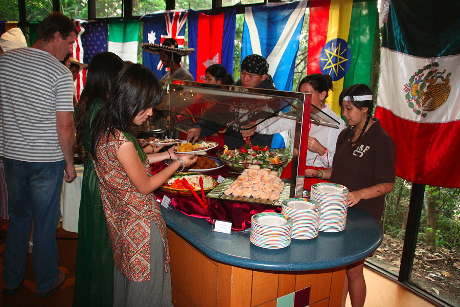 A very successful Orientation Week for our new students finished last night with an International Dinner and Show, presented by our 2nd Year students.  The event began with a special buffet dinner in the canteen, featuring the flavours of the world.  The food, lovingly prepared by our 2nd Year students together with the canteen staff, was served by students in national dress at various points in the canteen.  With national flags decorating the circular glass wall and the students in their national dress, it was certainly a colourful event where many students seemed to spend more time taking photos of each other than eating the great food.