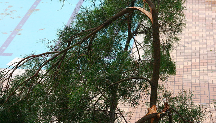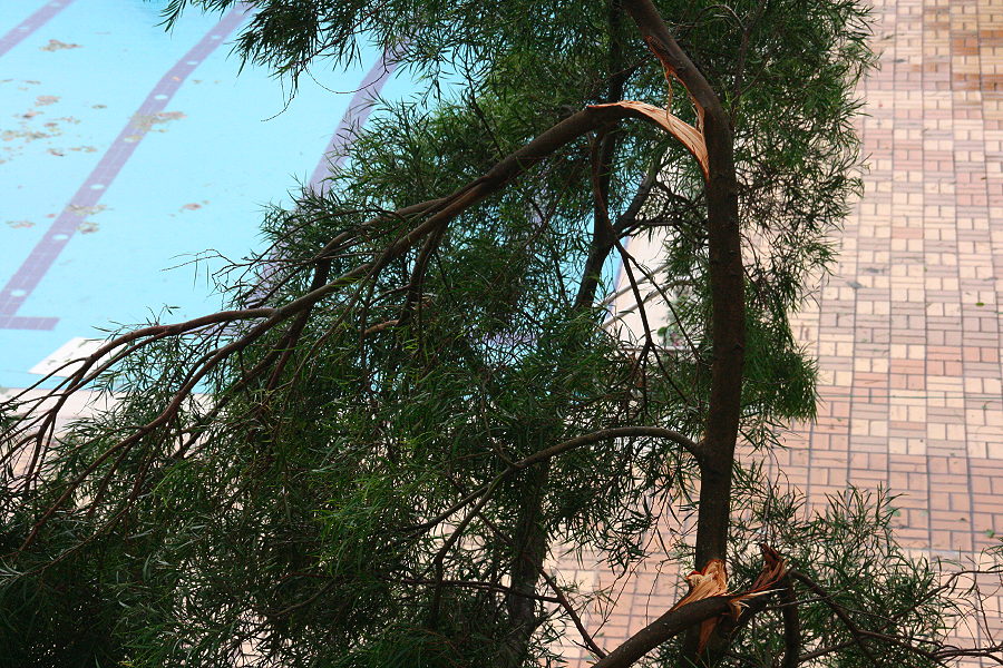 It is between rain showers, but the winds are still gusting at Force 3. The broken branches and the damaged pool light can be seen clearly.