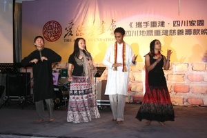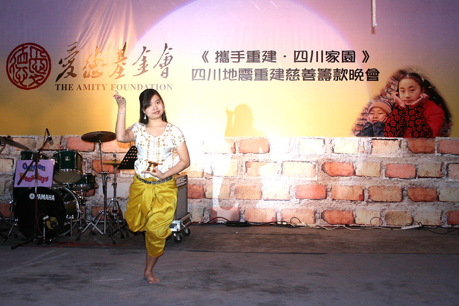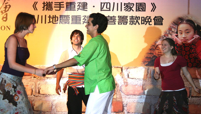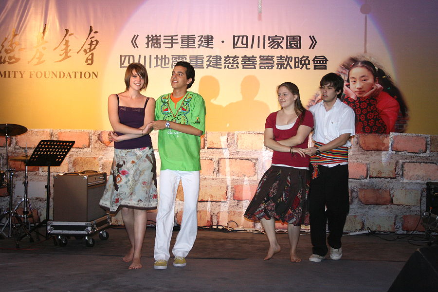 However, the focus this time was different.  The event was a fundraising dinner to support victims of last year’s earthquake in Sichuan, and our students were invited to provide some performances to add a multicultural feel to the evening.  We had originally proposed including our Chinese Dragon Dance among the performances, but unfortunately the dinner venue did not have enough space for this.  Therefore, we provided three types of performances - a traditional Cambodian dance (by Chansoknea, from Cambodia); some Latin American dances (by Pedro [Nicaragua], Alejandro [Paraguay], Rebecca [United States] and Anastasiya [Latvia]) and a South Asian dance (by Rigzom [Bhutan], Neto [East Timor], Junius [Indonesia] and Mona [Yemen]).
