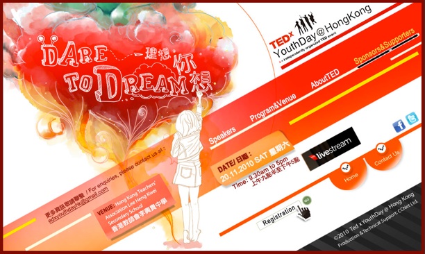 As background, TED is a non-profit organisation that encourages the dissemination of ‘ideas worth spreading’. It began as a four day annual conference in California 25 years ago to which speakers were invited to speak for 18 minutes each. Although the conferences themselves are very expensive (about US$6000 I understand), the lectures are videoed and made available for free. In addition to the annual conference in California, there are now annual conferences in Oxford (UK) and an increasingly vast range of TEDx conferences, the latter being independently organised events around the world that give opportunities for local people to share a TED-like experience. Yesterday’s TEDx youth conference in Hong Kong was one of about 60 held on the same day around the world (http://blog.ted.com/2010/11/19/tedxyouthday-is-on/).