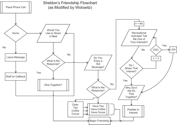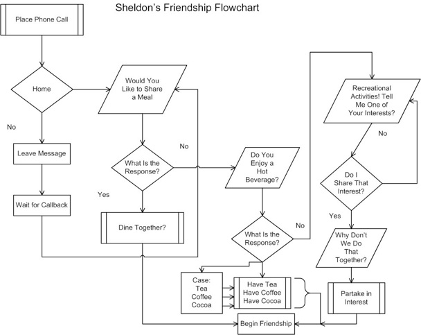In this clip, Sheldon creates a friendship flowchart to describe the algorithm which he believed made it inevitable that he would make friends. The flowchart looked like this: