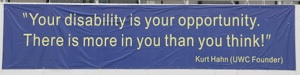The second part of Hahn’s quote – “There is more in you than you think” – came from graffiti that Hahn had seen written on the wall of a derelict building in Belgium before World War II (originally “Plus est en vous”).  These words became the motto of the school that Hahn founded in Britain (Gordonstoun) shortly before he became involved with establishing the first United World College.  Moreover, the words became the essence of the philosophy that he wished would underpin the UWCs: that each of us has more courage, more strength and more compassion than we would ever have suspected.