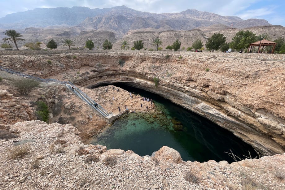 I returned to the main highway and continued my drive southwards. For most of the rest of my drive away from Muscat, the highway followed the coastline very closely, making a beautiful drive along the largely undeveloped, natural coastline with its clear azure water despite the grey clouds overhead. About half an hour from Hayl al Ghaf I arrived at my third stop, the Bimmah Sinkhole. Located about a kilometre inland from the coastline, the sinkhole measures about 40 metres in diameter and is about 20 metres deep.
