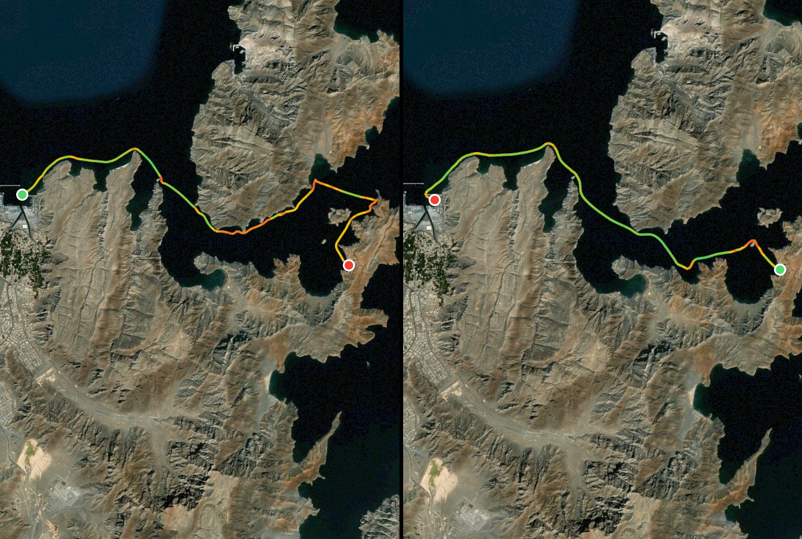 My driver arrived right on schedule at 10:00am to take me to the port area In Khasab, although it was about 10:40am before we left the wharf. Our trip did a wonderful circuit of one of the largest khors near Khasab, Khor ash Sham. I was actually able to track our path and record it by ‘telling’ my watch that I was starting an outdoor cycling workout. The trip around Khor as Sham took a total of just over 30 kilometres, divided into two parts. (In the satellite photo, the left side shows part 1, starting in Khasab (green dot) and finishing in Maqlab (red dot), while the return from Maqlab to Khasab is on the right side).