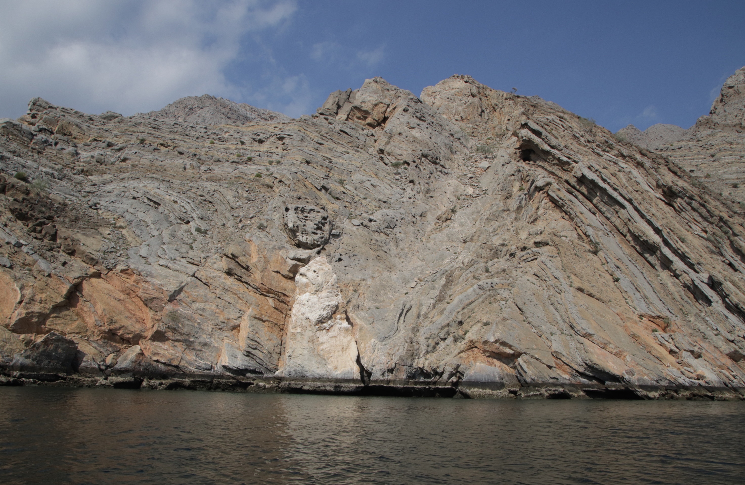 The first part of the trip travelled east from Khasab before entering Khor ash Sham, staying fairly close to the northern side of the khor most of the time. Although there were some patchy clouds, the sun shone most of the time, illuminating the spectacularly tilted and folded limestone formations to perfection. My driver (the same man who had collected me in his car from the hotel) spoke almost no English, but he had the vocabulary to describe two important features in the rocks – “fish’s head” and “moustache” – plus a third word, “dolphin”, to explain why we were spending a long time circling in one area for about 15 minutes. Dolphins are often found in that area, and although a tiny white surface splash at one point may have been caused by a shallow dolphin, no dolphins revealed themselves.