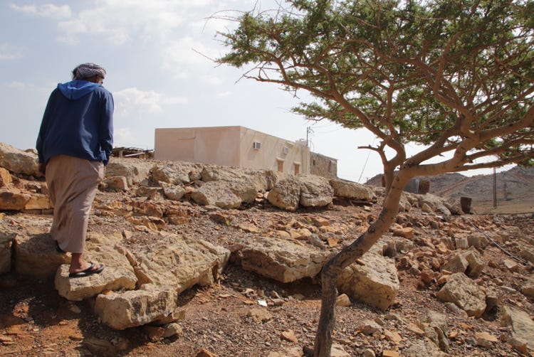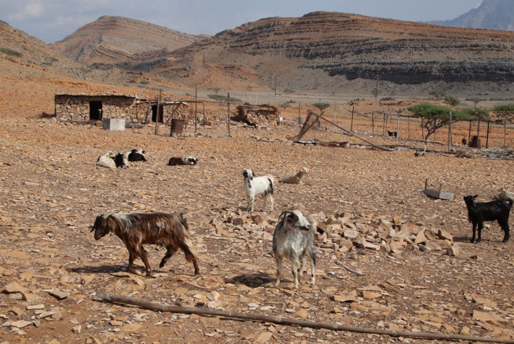 An hour and a half into our trip, having travelled (but not really cycled) 17.2 kilometres, we pulled into a small inlet within the khor. Our destination was a tiny farming hamlet named Maqlab. We tied the boat to some rocks, there being no wharf, walked across a small beach and started ascending some roughly made concrete steps. After a few minutes we reached an elevated, slightly undulating area. We walked past several houses, then up another gentle rise, past a small herd of goats grazing on nothing but sharp rocks to one of the houses. My driver gestured to let me know it was his own home and he wanted to invite me inside.