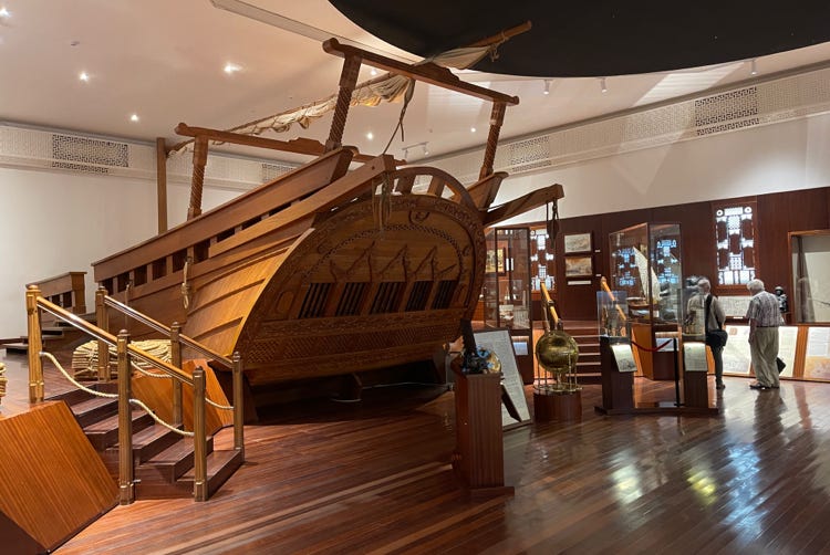 The entry fee also included the Frankincense Museum. The museum is small and built in a courtyard style with a frankincense tree in the middle. There are several exhibition halls but only two were open, the Maritime Hall and the History Hall. Both were excellent, with very well laid out displays that were explained clearly and concisely. I should add that the air conditioning was also working very well. Interestingly, and (to me) surprisingly, the Museum was far more popular than the Al Baleed archaeological site.