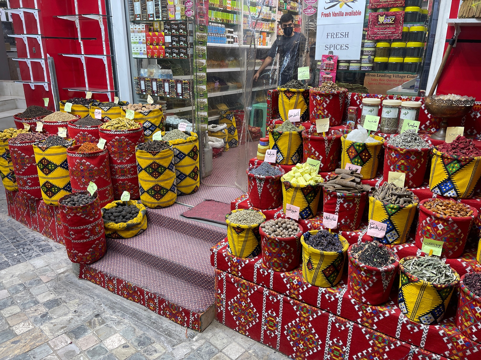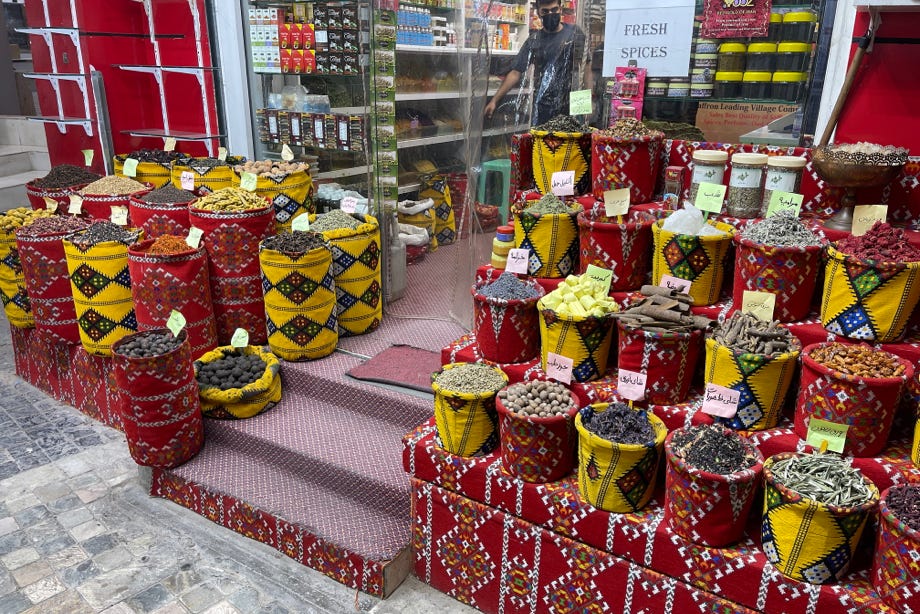 We parked the car in an area of old housing and walked along several backstreets before entering the maze of covered laneways that comprise Mutrah’s souq (or traditional markets). It was already sunset by now, and so most of the day’s activities had ceased. Nonetheless it was still possible to sense the colour and vibrancy of the markets as well as, from the time to time, the aromas of the spices and frankincense that were on sale.
