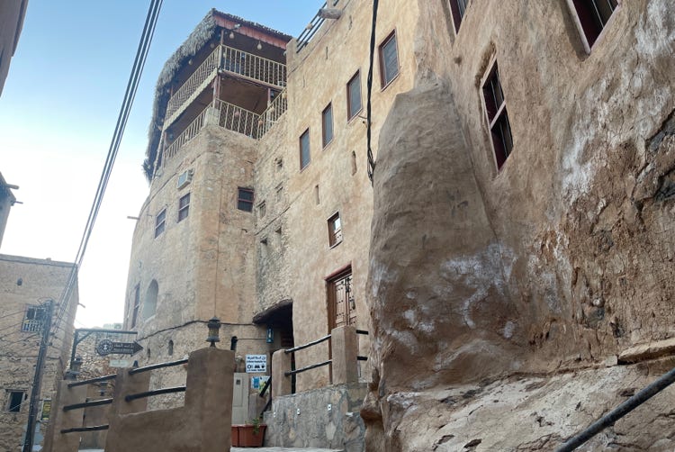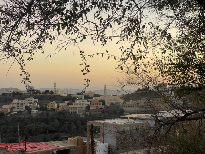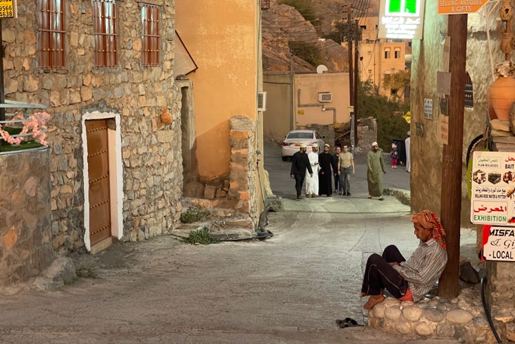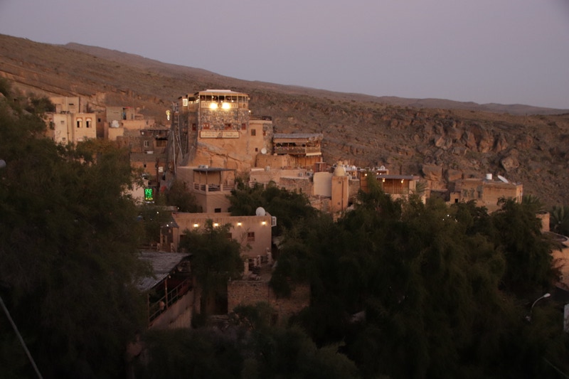 My guesthouse is built on the rock outcrop, which means it offers great views along the gorge and over the lower part of the village below, a fair proportion of which is in ruins. My accommodation included dinner as well as breakfast, and the owner, Abdullah, invited me to join him at his table with two of his small children. Over dinner, he gave the extraordinary history of the village – the watchtower that was built by the Persians in pre-Islamic days, its now abandoned old site, the renovations that have been done to preserve Omani culture, and so on. It was really engaging – and the food was also excellent, much of it coming from the village’s own irrigated terraced gardens.