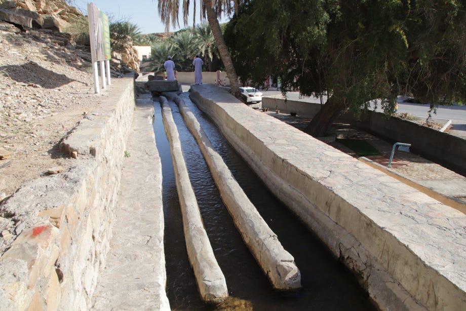 I made two stops on my way this afternoon. The first was in the small town of Birkat Al Mouz, several kilometres east of Nizwa. If I had not been running an hour later than I had expected I would have spent more time there as there are some interesting ruins from tribal groups as well as some beautiful banana and date plantations there. My stop was in the centre of the town and focussed on the UNESCO World Heritage “falaj”, or traditional irrigation system. It was definitely worth seeing, but the pressure of time on these short winter days was an unwelcome stress.