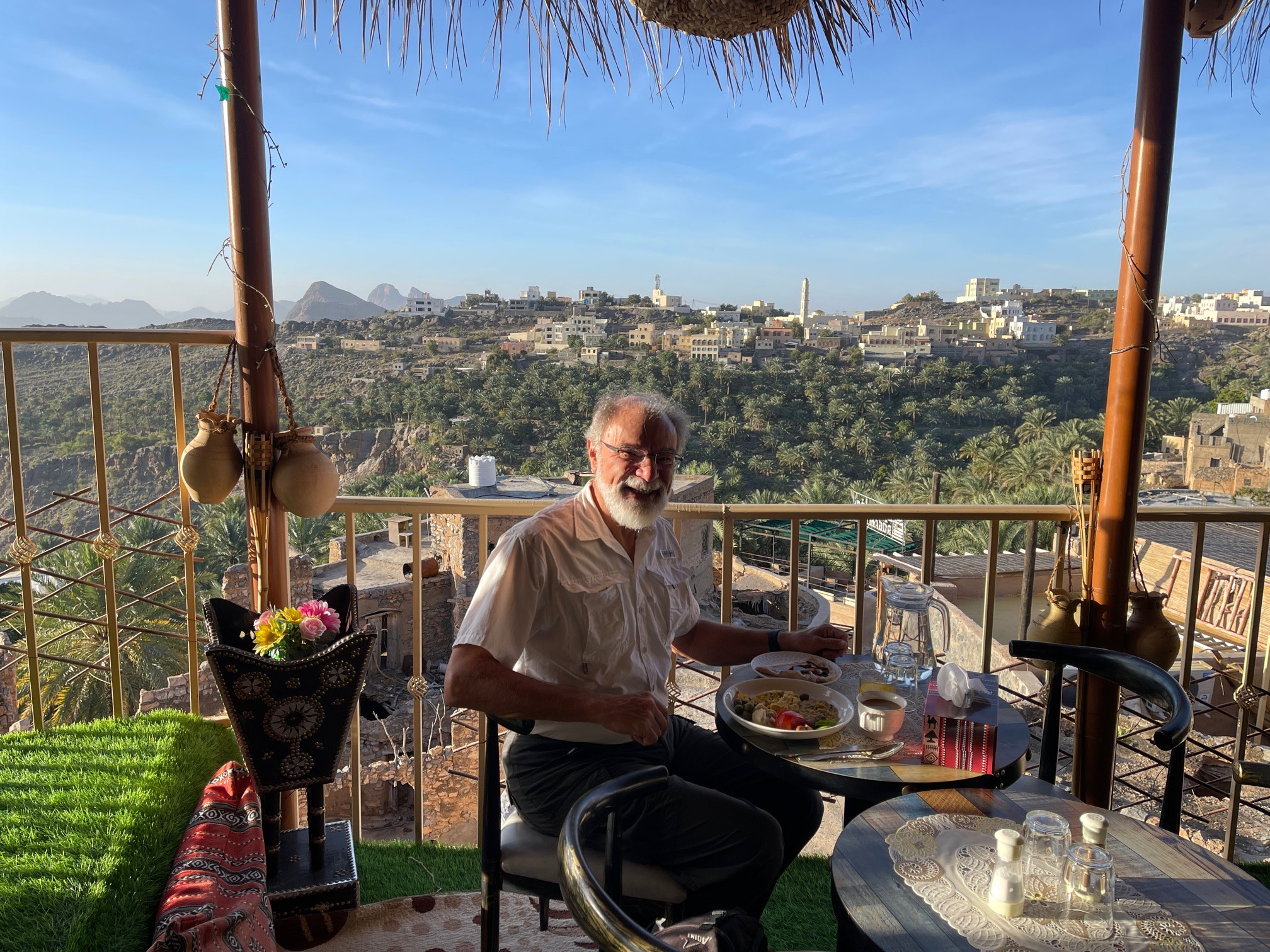 He showed all kinds of bric-a-brac that he has collected in the village over the years, and presented it in a highly informative way that gave a great insight into the village’s history from its Persian occupation about 2,500 years ago, through to its evolution from a nearby abandoned settlement to its present site, initially as a walled village with six easily defended gates, up to the present day. He pointed out the old Persian watchtower, the newer ‘star clock’ across the valley, and as a highlight, offered us the chance to wear traditional Omani formal wear (note I participated in this not as cultural appropriation but to honour my very gracious, enthusiastic and highly hospitable host).