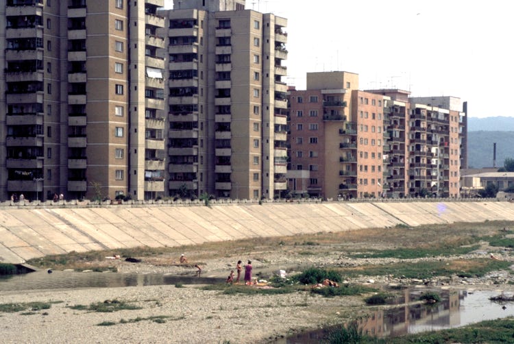 Having completed (and survived) the Transfăgărăşan Road, I continued my drive south to the small city of Râmnicu Vâlcea. This city does not rate a significant mention in any tourist guide. Nonetheless, I was especially keen to call in because I had made a stop there in 1987 to get some photos of several recently constructed socialist housing blocks with residents doing their washing in the adjacent waterway, a small tributary of the River Olt. I was interested to see if the buildings were still there, and if so, in what condition.