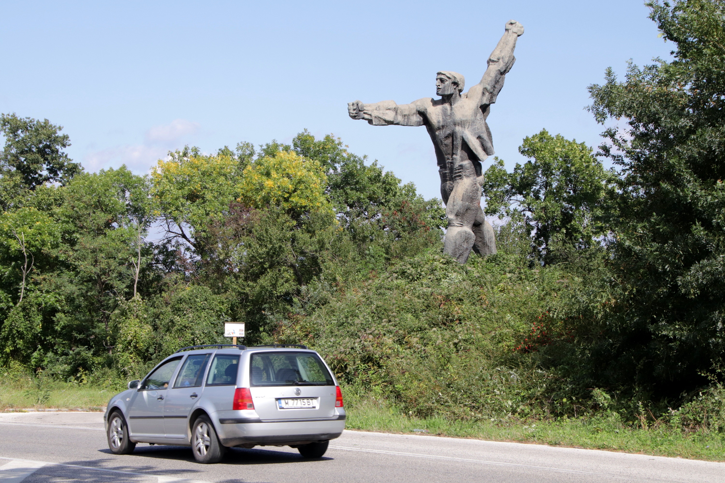 I continued my drive south, passing through alternate bands of sunlight and thick clouds as I did so. I made one brief unplanned stop just north of the village of Barzia (Бързия) where I came across a large socialist-era monument of the type that was commonplace during my drive through Bulgaria in 1987. This seemed to be a large example of a mass-produced standard statue from the Communist era based on Ivan Neshev’s 1969 sculpture titled “First Day”, the original of which is now in the Museum of Socialist Art in Sofia. Today’s monument near Barzia was the only one I saw on today’s drive, a bit disappointing but hopefully there will be many more to see during my travels in the coming week.