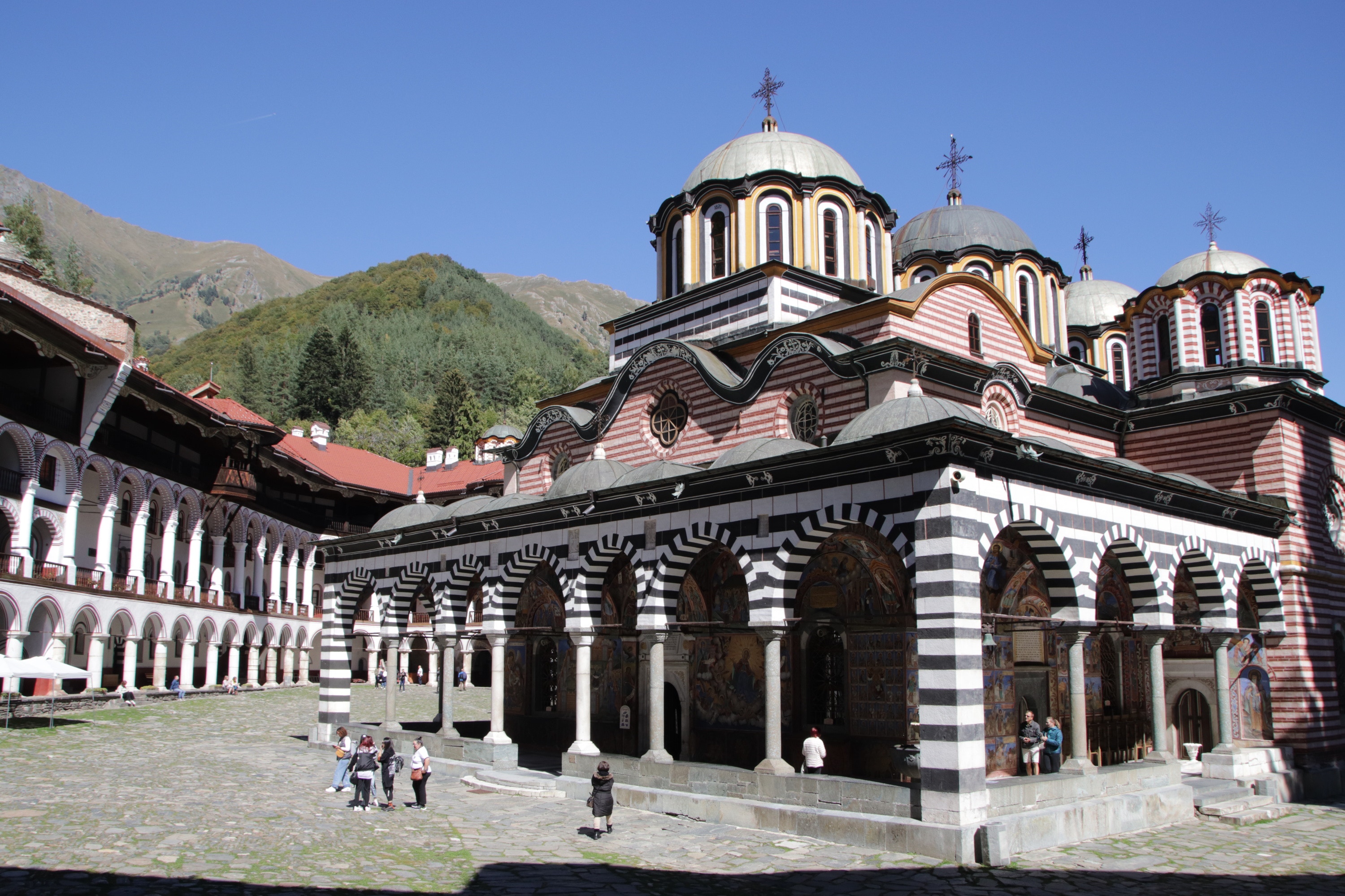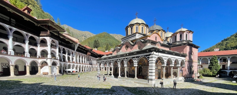 When travel books and websites portray key images of tourism in Bulgaria, Rila Monastery is invariably one of the images chosen or considered. Situated just 120 kilometres by road south of Sofia in the Rila Mountains, this Orthodox monastery rises up from the valley floor in a colourful mass of colours framed with bold black and white stripes and surrounded by steeply sided green hillsides. It’s just the kind of place where you want the sun to be shining and when you visit, and today didn’t disappoint. The weather was clear with bright blue sunny skies all day, the cold wind having blown away the clouds overnight. It was only 8°C until early afternoon, but the bracing conditions were refreshing in their own chilly kind of way.