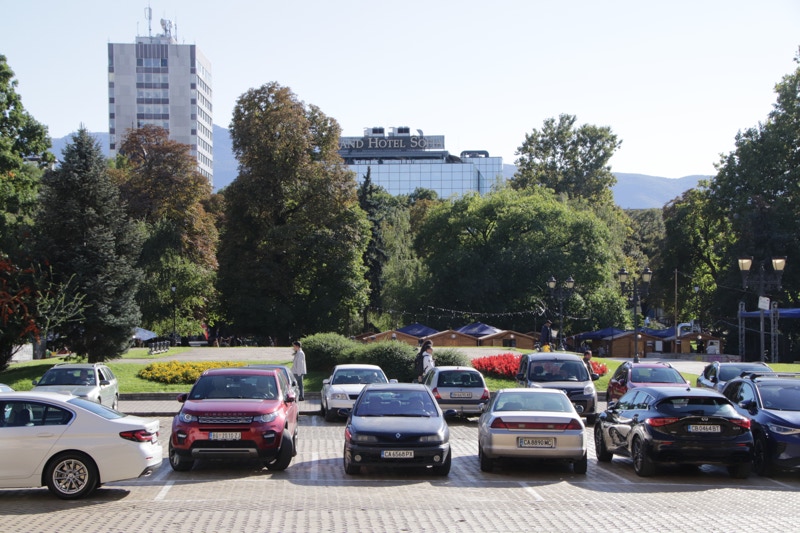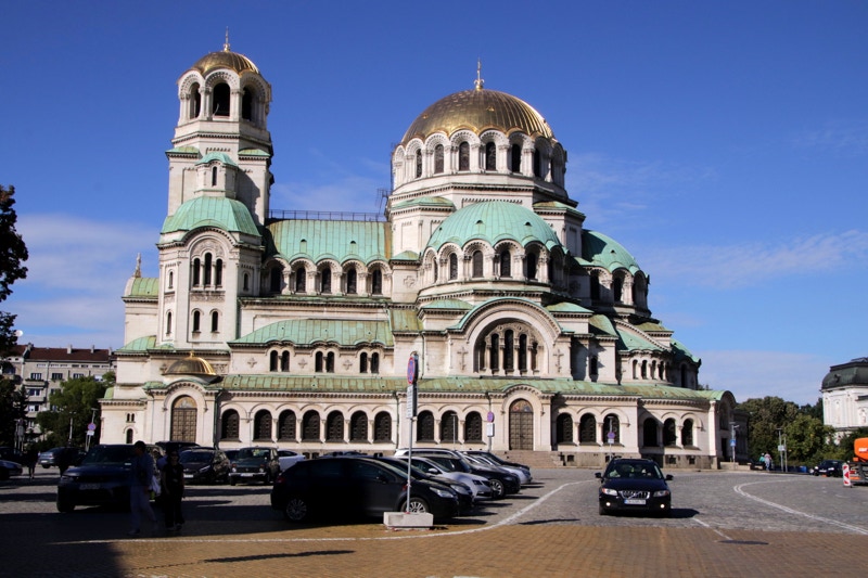 I began my walk at the Aleksander Nevsky Orthodox Cathedral, located just a block to the north of my hotel. This huge building is a major landmark of Sofia, and is regarded by many as a symbol not only of the city but of Bulgaria as a nation. Interestingly, this was where we parked our car in 1987 when we stopped in Sofia for an hour or two during our day’s long from Plovdiv to Yugoslavia, and so a comparative photo pair appears below. In 1987 we didn’t go inside the church (it was firmly closed), but I did go inside this afternoon. It was huge, it was dark, it was cold, but it was decorated in the lavish style that typifies Orthodox churches.