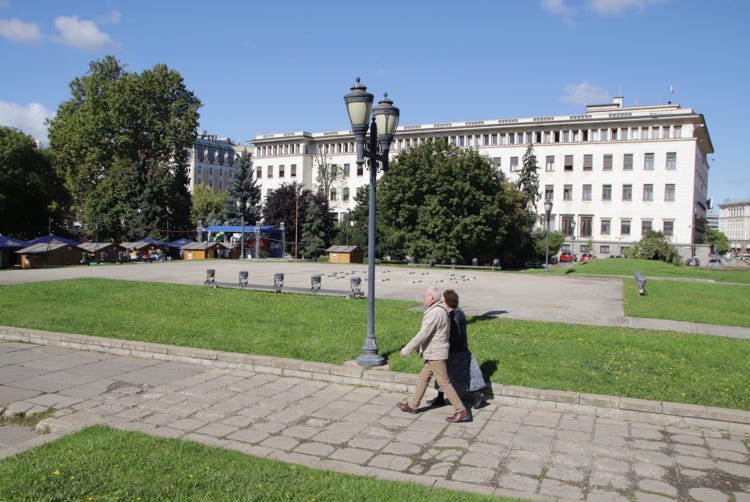 I continued walking west along Ulitsa Moskovska and was surprised to see some interesting sculptures in a small park behind the Palace National Art Gallery, including some communist-era workers and peasant statues, and an obviously post-Communist sculpture of the iconic East German Trabant (a distinctive and infamous type of car) with a head protruding through its roof.