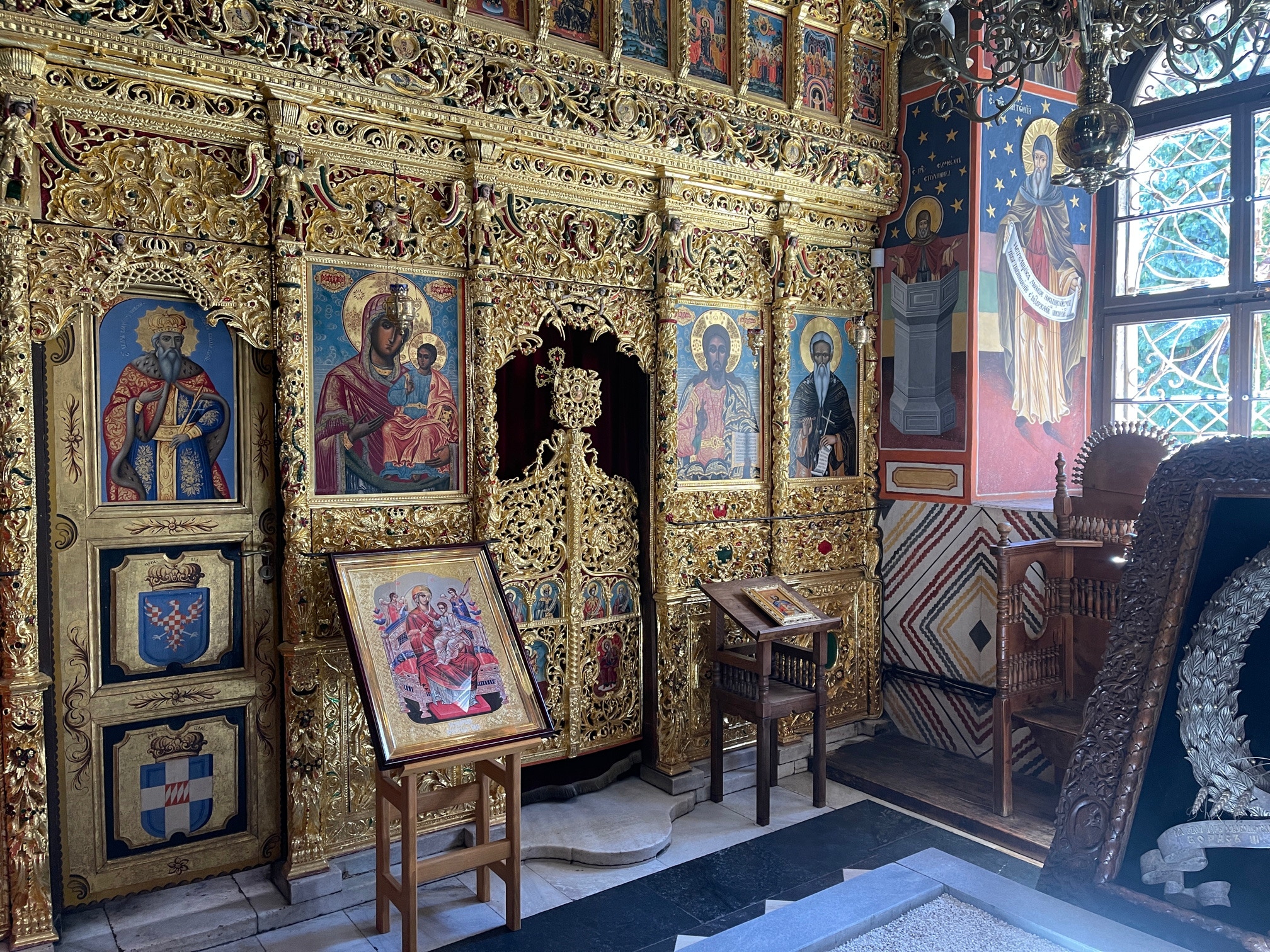 The interior of the church was similarly magnificent although much less well illuminated. At the front of the church there is a large elaborate carved wooden iconostasis, and in the middle of the chapel hangs an absolutely huge golden chandelier adorned with the faces of Biblical saints.