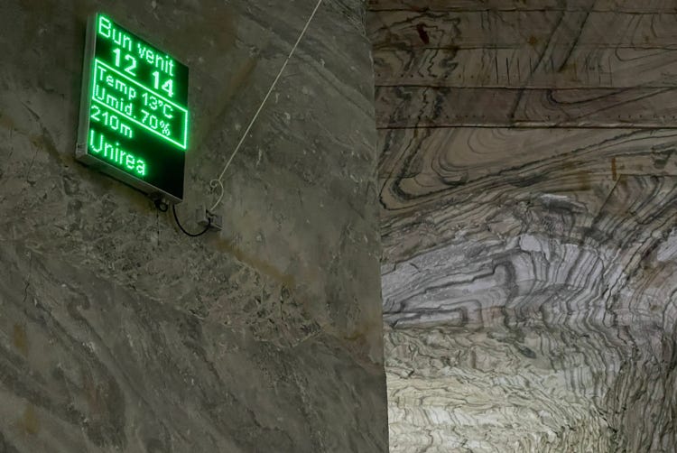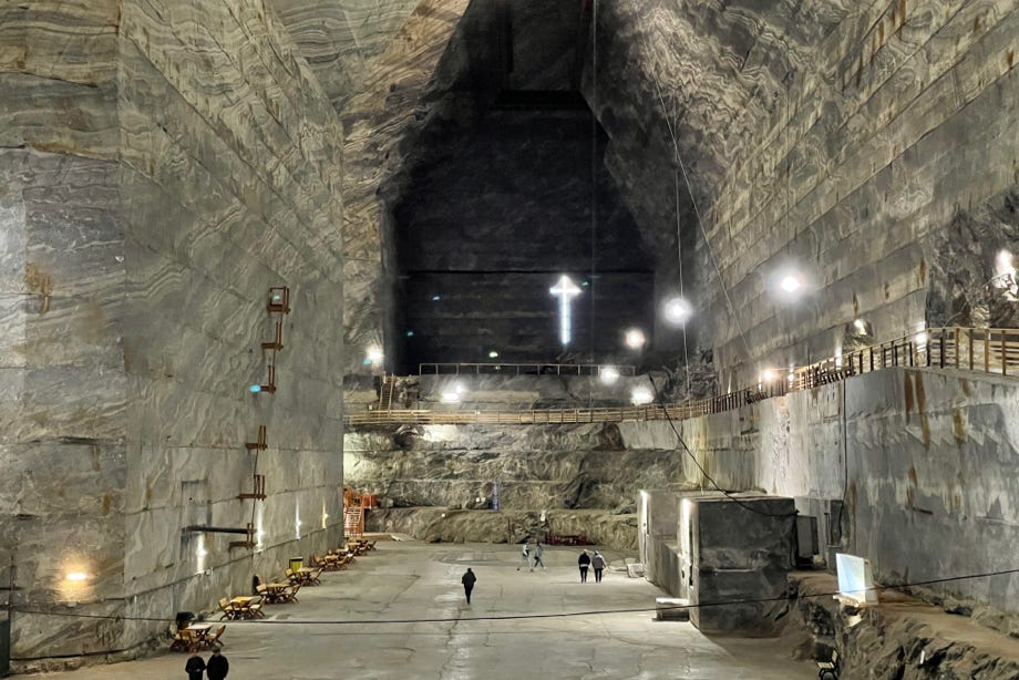 I left my hotel at about 9:15am and tackled Bucharest’s horrendous traffic, breathing a sigh of relief as I reached the relative calm of countryside roads. I arrived in Slănic at a little before 11:00am, parked my car and bought my entry ticket to the salt mine (35 lei, about $10.50 Aust., being the discounted senior price – usual price being 50 lei).