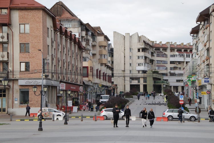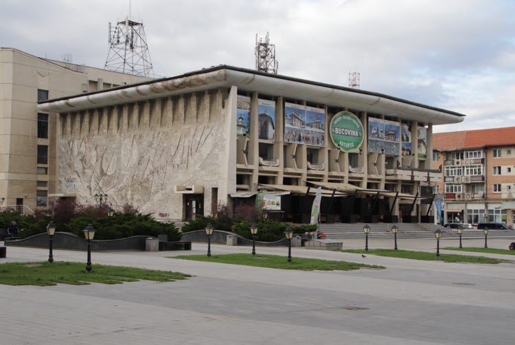 I walked through Central Park, which was dark and windy, to Piaţa 22 Decembrie, the city’s large open central square named after the date of the uprising that overthrew Nicolae Ceauşescu. It is difficult to imagine a more sterile, unimaginative city centre than Piaţa 22 Decembrie, which is a paved area almost devoid of people encircled on three sides by socialist high-rise buildings with a Communist-era theatre on the fourth side, its façade horribly defaced by a massive advertisement for beer. There was one gesture towards some lively fun – a large sign saying Suceava with a red heart for the “v”. Maybe it was the grey skies overhead and the cold wind, but I felt Piaţa 22 Decembrie needed more than a red heart to give some life to the area.