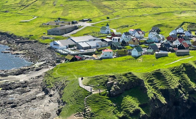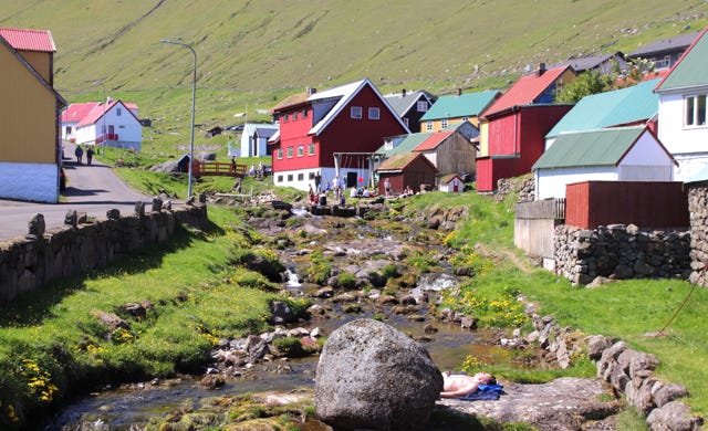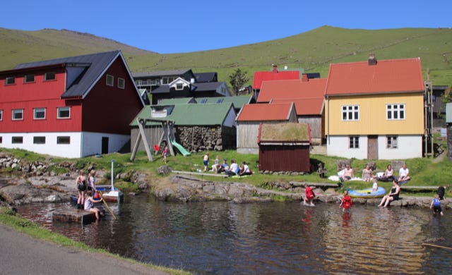 I checked my weather app and saw that the only area in the Faroe Islands that was fog-free today was the far north, which made it our obvious destination for the day. Our ultimate destination was the small town of Gjógv. Being a warm, sunny Sunday, the town was a hive of activity with many of the locals swimming in the small stream that flowed through the town. We enjoyed a steep, outrageously scenic walk up from the old port along the cliff tops that provided fabulous views over the town and the surrounding glacially sculpted valleys. We took a diversion on our return trip to Tórshavn to visit another small farming community, Elduvík. When returned to foggy Tórshavn the hotel staff commented that we seem to have made the most of this year’s three day-long summer, suggesting that our luck of sunny days might soon come to an end.
