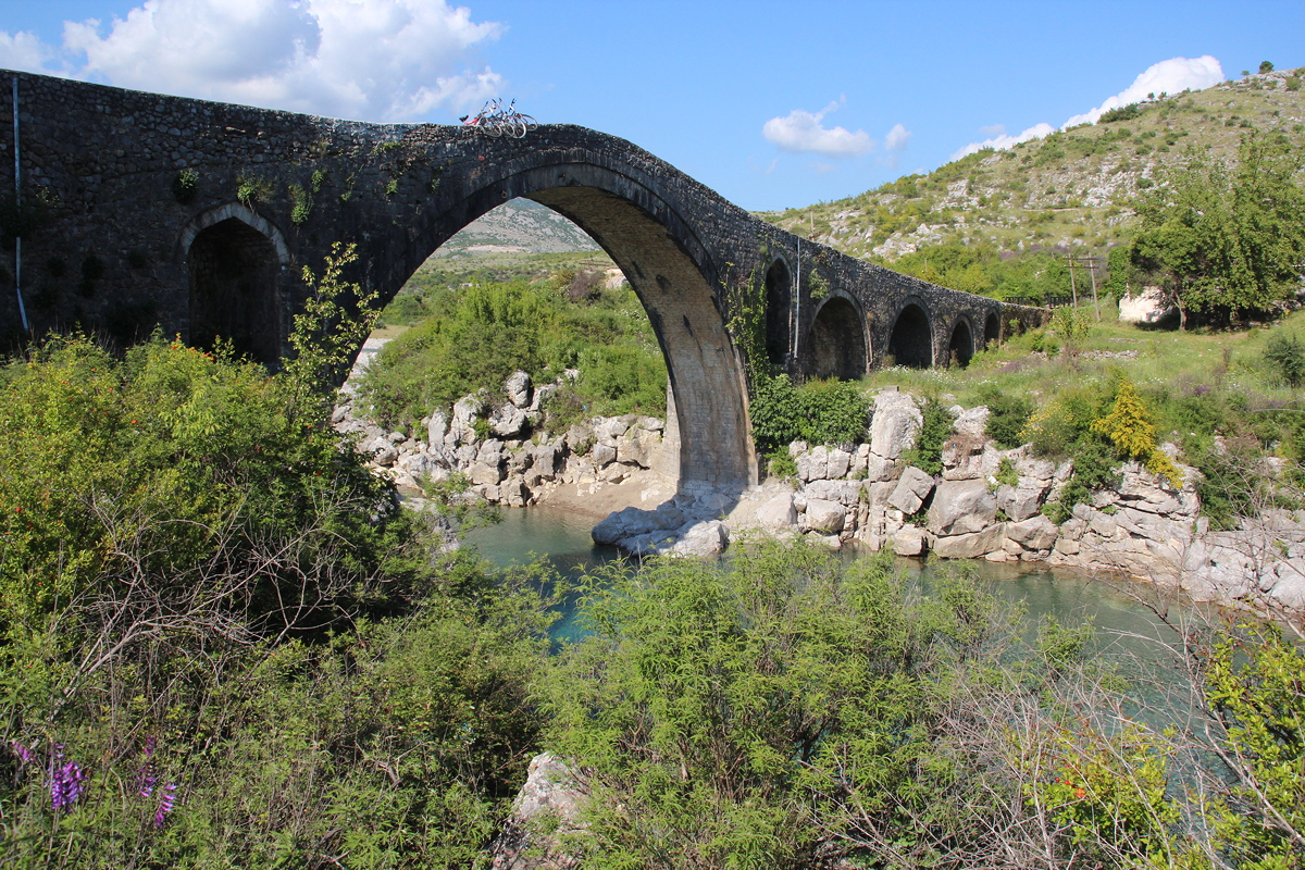 Our final visit using the car today was 11 kilometres to the north (7 kilometres north of Shkodër’s city centre) in the village of Mesi, the Ura e Mesit, more commonly known in English as Mesi Bridge. This beautiful 108 metre long bridge was built during Ottoman rule in 1868. With 13 arches and a curve in its pathway, the bridge was built to bring timber from the nearby mountains to Ulqini, then Shkodër’s port. The bridge was used until 1965 when it was replaced by a much plainer, but apparently safer, bridge beside it.