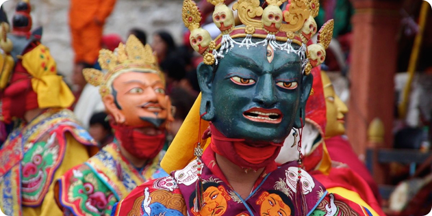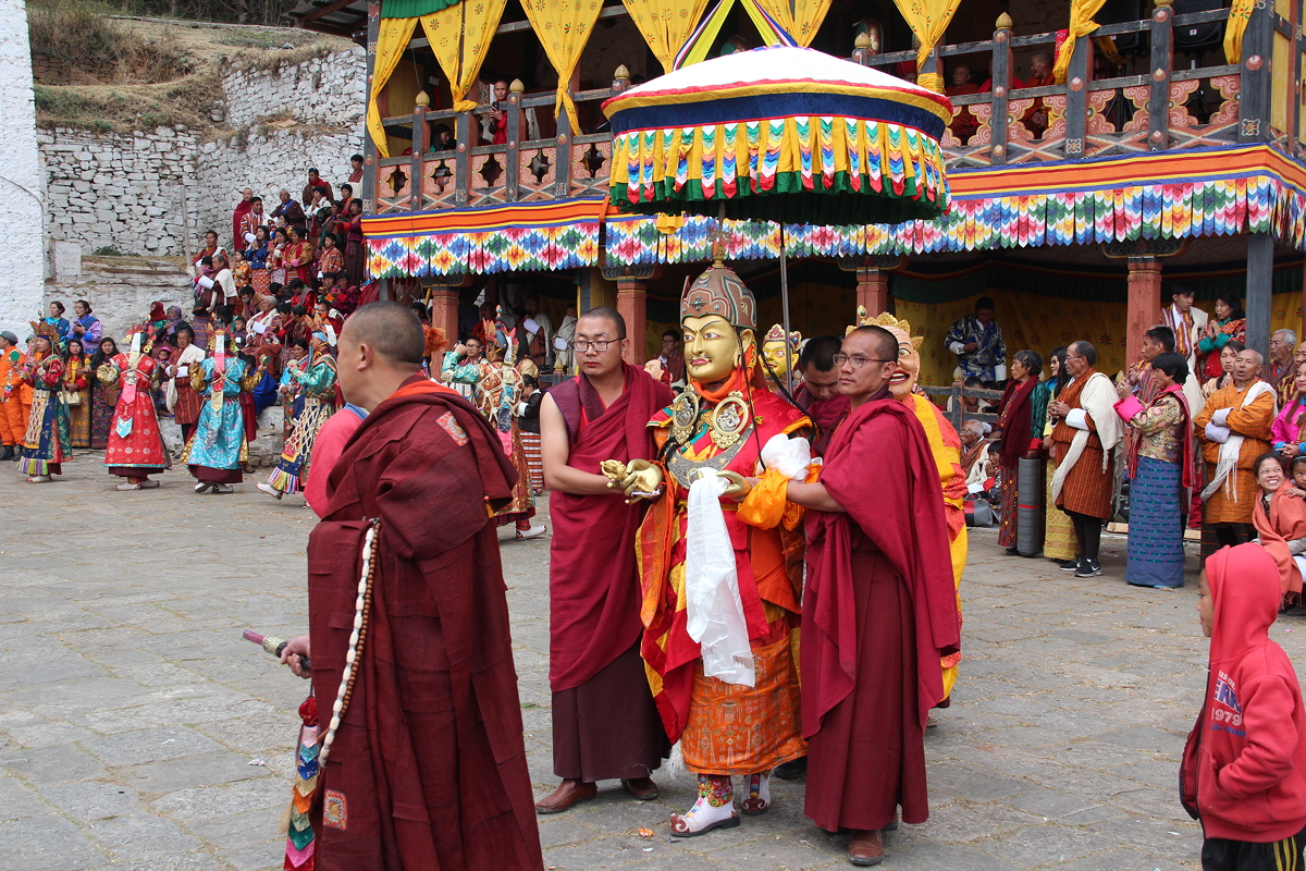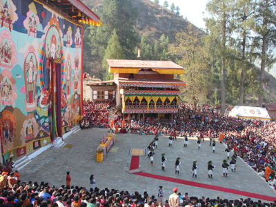 A combination of monks and lay folk dressed in elaborate silk brocade costumes performed several dances with the common theme of good triumphing over evil to the accompaniment of haunting sounds from long trumpets, cymbals and flutes. The dances and costumes have survived unchanged for many centuries, and each dance was a precise re-enactment of visions seen by Bhutan’s great Buddhist saints in which any changes made by the performer would be viewed as sacrilege. Among the dances performed were ‘Lords of the Cremation Grounds’, ‘Terrifying Deities’, ‘Heroes’, ‘The Eight Manifestations of Guru Rinpoche’, ‘Dance of the Sixteen Fairies’, and ‘Religious Song’, with the performances interspersed with folk songs and clowning.