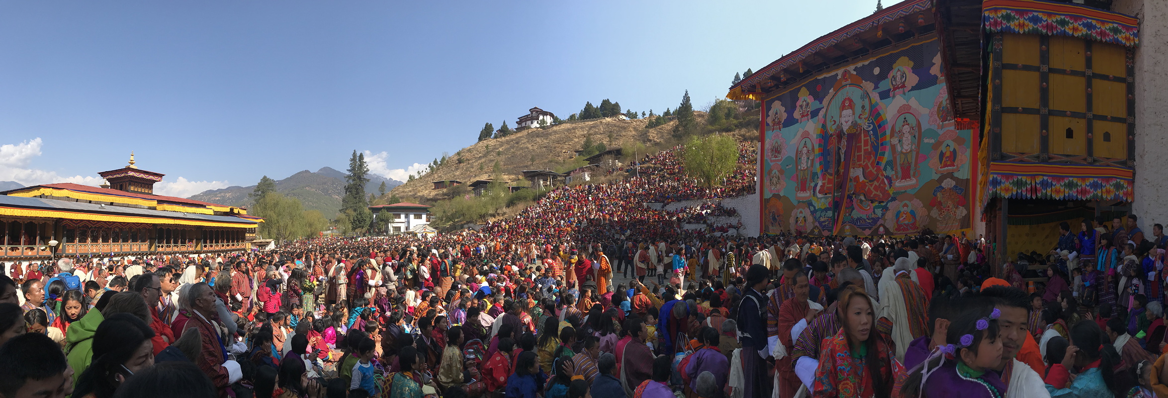 As we approached the area where we had witnessed the tshechu performances the day before yesterday, two things were immediately apparent. First the thongdrol was covering the side of the building, confirming to everyone that the king would definitely be coming (this is never announced officially beforehand for security reasons). Second, the size of the crowd was far larger than we had experienced two days earlier – not only was the area around the performance field occupied, but all the areas approaching it. This was not a good place for people who don’t like crowds, because this crowd was a big one!